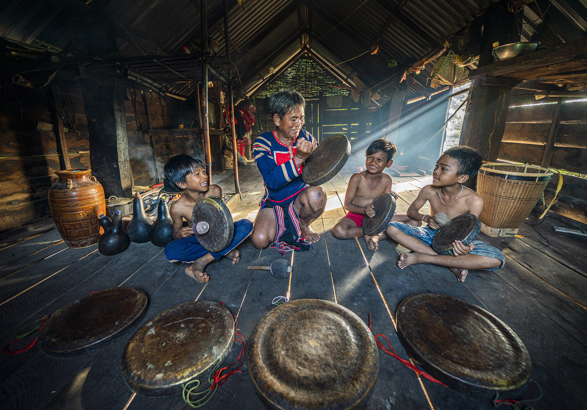 Dạy đánh chiêng. Ảnh: PHẠM CÔNG QUÝ