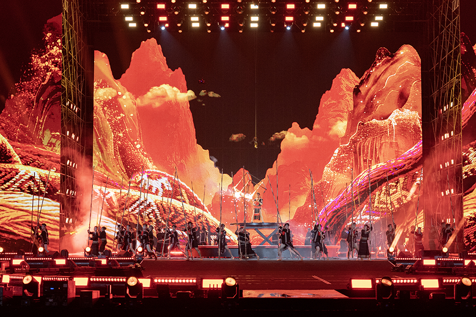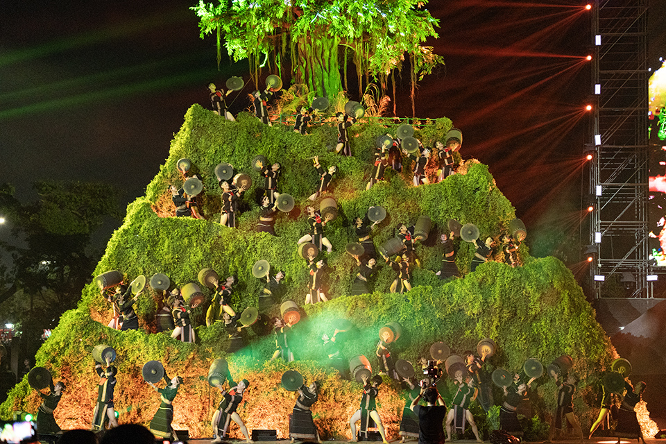 Chương Linh khí đại ngàn mở ra không gian văn hóa đậm đặc bản sắc Tây Nguyên – nơi thiên nhiên, con người và tâm linh hòa quyện thành một chỉnh thể sống động. Không gian sân khấu được dẫn dắt bằng âm thanh cồng chiêng ngân vang, trầm hùng. Trên nền âm thanh ấy, các lớp vũ đạo tái hiện đời sống sinh hoạt, lễ hội và tín ngưỡng. Những hình ảnh quen thuộc như nhà rông, bếp lửa, lễ hội, vòng xoang… được tái hiện bằng ngôn ngữ sân khấu hiện đại, giúp khán giả dễ dàng tiếp cận mà vẫn giữ được chiều sâu văn hóa. Phân đoạn cao trào của chương là tiết mục Ngọn lửa cao nguyên của nhạc sĩ Trần Tiến do Anh Tú và vũ đoàn MQ DANCE TEAM thể hiện, lần nữa khắc họa hình ảnh đất và người Tây Nguyên.
