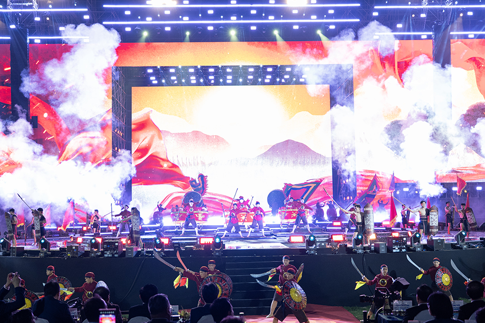 Chương Hào khí Tây Sơn trở thành điểm nhấn giàu cảm xúc của đêm diễn khi tái hiện sinh động tinh thần lịch sử hào hùng gắn với vùng đất Bình Định. Mạch diễn mở ra từ hình ảnh những người thợ rèn miệt mài tôi luyện binh khí trong ánh lửa thép và nhịp trống dồn dập, gợi không khí chuẩn bị khẩn trương cho một cuộc xuất quân lớn. Từ đó, sân khấu chuyển nhanh sang cảnh ra trận với đội hình, vũ đạo mạnh mẽ, đậm chất chiến binh, khắc họa khí thế bừng bừng của nghĩa quân Tây Sơn. Cao trào khép lại bằng hình tượng chiến thắng rực rỡ, cùng cuộc “gặp gỡ” đầy biểu tượng giữa hoàng đế Quang Trung và công chúa Ngọc Hân, để lại dư âm hào sảng và lắng đọng.