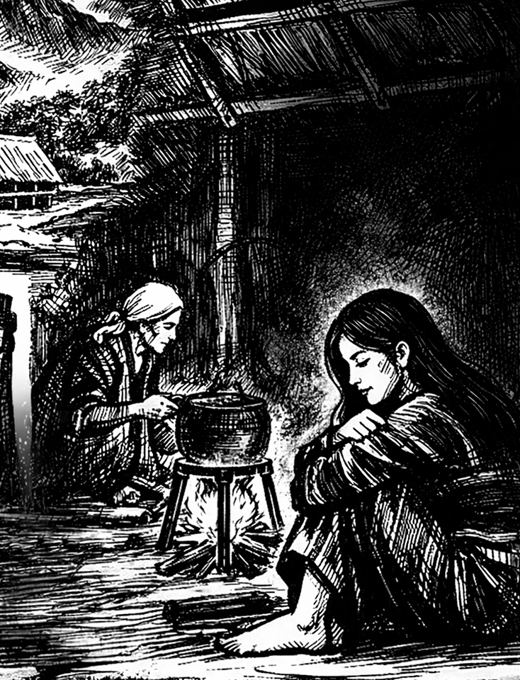 Những ngày ấy, cuộc sống trôi qua phẳng lặng. Ja Ri đeo chiếc gùi mây nặng trĩu những bắp ngô non, mùi sữa ngô thơm lẫn vào mùi mồ hôi chua nồng trên áo. Dì H’Blan lầm lũi đi trước, tấm lưng còng xuống như gánh cả góc trời xám xịt xa xa chuẩn bị đổ mưa. Trên rẫy, hai dì cháu cúi mặt làm cỏ, tiếng cuốc va vào đá lách cách. Nắng xiên khoai, đổ lửa khiến những giọt mồ hôi của Ja Ri chưa kịp rơi đã bết lại trên tóc. Bữa cơm trưa diễn ra ngay tại chòi rẫy với cơm lam chấm muối ớt xanh, cà đắng và vài con cá suối bóp chua. Gió đại ngàn thổi thốc vào chòi, mang theo mùi đất từ xa.