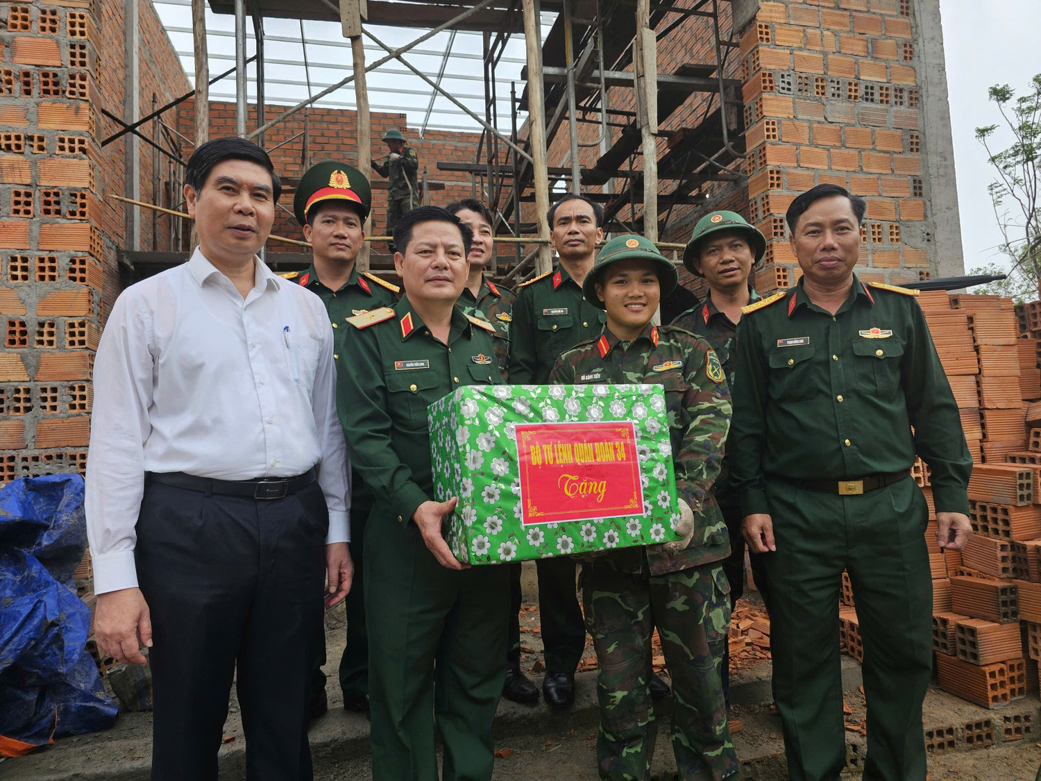 Phó Chủ tịch UBND tỉnh Lâm Hải Giang (bìa trái) và Thiếu tướng Nguyễn Trần Long – Phó Chính ủy Quân đoàn 34 (thứ 2 từ trái sang) thăm, động viên và tặng quà cán bộ, chiến sĩ đang hỗ trợ người dân xây dựng nhà. Ảnh: H.P