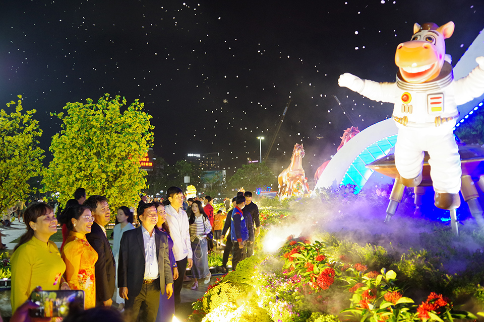 Cùng với cụm linh vật, khu vực khuôn viên Tượng đài Nguyễn Sinh Sắc – Nguyễn Tất Thành cũng được trang trí các loại hoa xuân, kết hợp trưng bày 70 bức ảnh chủ đề “Đất và người Gia Lai” mừng xuân Bính Ngọ 2026.