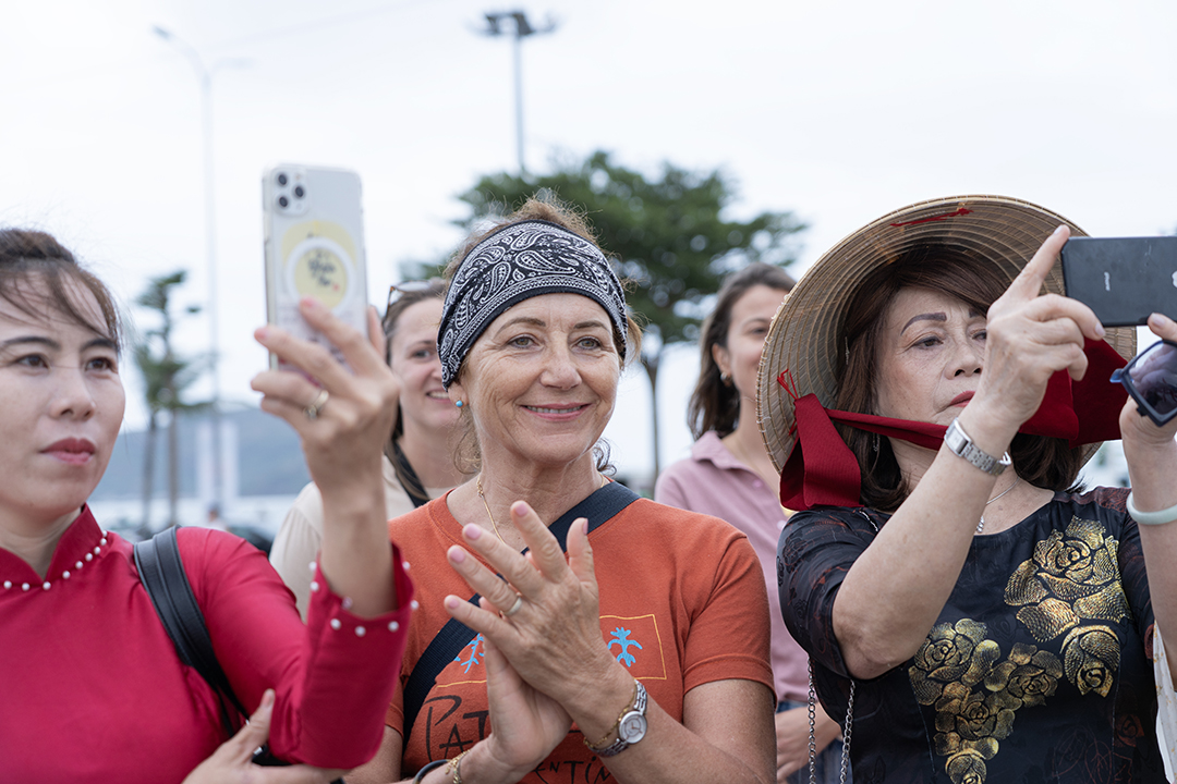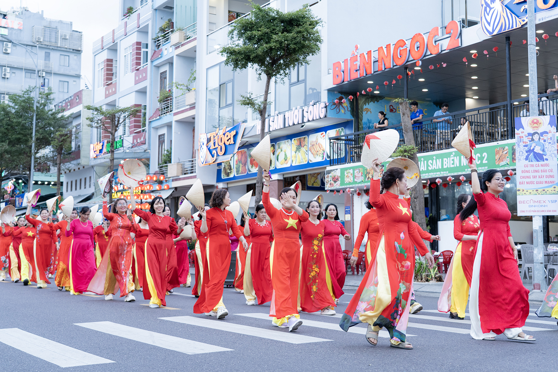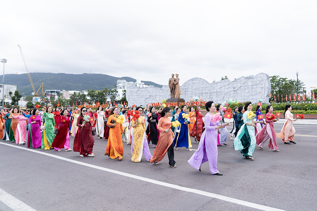 Các hội viên phụ nữ đến từ Hội Liên hiệp phụ nữ các phường: Quy Nhơn, Quy Nhơn Nam, Quy Nhơn Bắc, Quy Nhơn Đông, Bình Định và xã Tuy Phước cùng đồng diễn áo dài trên nền nhạc các ca khúc Xinh tươi Việt Nam và Đến với con người Việt Nam tôi. Sau đồng diễn là phần diễu hành qua các tuyến phố (khoảng 1km) xuất phát từ Quảng trường Nguyễn Tất Thành, qua vòng xuyến Nguyễn Huệ, dọc theo đường Xuân Diệu và dừng lại biểu diễn dân vũ tại khu vực ngã ba Xuân Diệu – Ngọc Hân Công Chúa (Sân khấu Hội tụ) trước khi quay trở lại điểm xuất phát. Chương trình đồng diễn và diễu hành áo dài đã tạo không khí sôi động, đầy sắc màu, thu hút sự quan tâm, cổ vũ của Nhân dân và du khách.