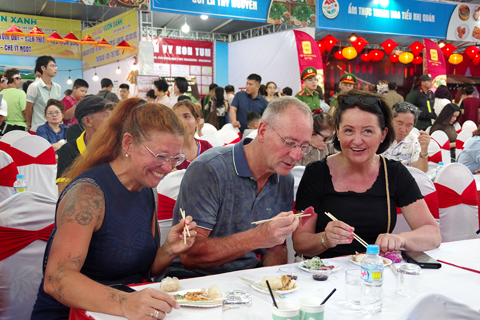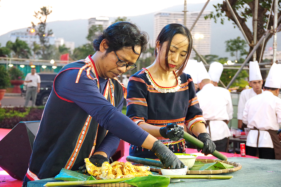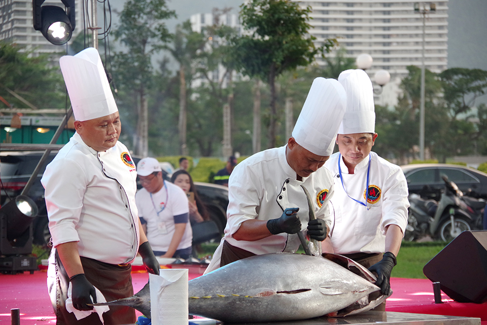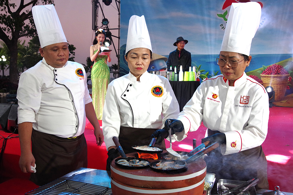 Điểm nhấn của sự kiện là không gian quảng diễn ẩm thực, nơi các nghệ nhân và đầu bếp trực tiếp chế biến những món ăn đặc trưng như cá ngừ đại dương, bánh xèo tôm nhảy, gà nướng, cơm lam… trước sự chứng kiến của đông đảo du khách.