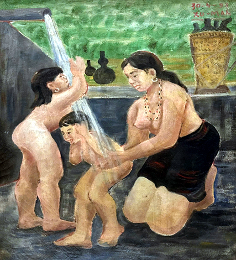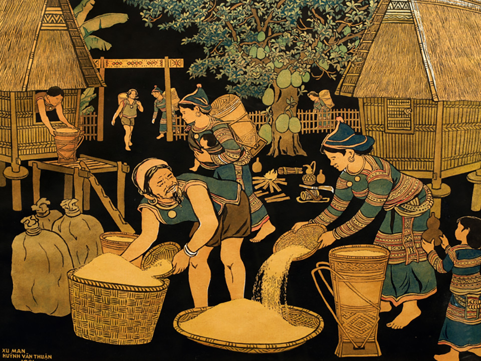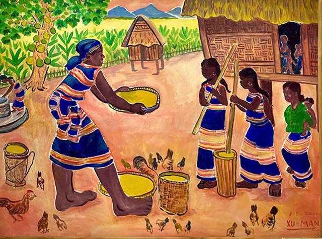 Tuy nhiên, điểm làm nên bản sắc của Xu Man nằm ở chỗ ông không dừng lại ở trạng thái “nguyên sơ tự nhiên”, mà tái ý thức hóa và bản địa hóa nó theo tinh thần Tân Nguyên thủy. Cái “vụng dại” trong tranh ông không còn là sự ngẫu nhiên hay thiếu kỹ năng, mà là một thủ pháp có chủ đích nhằm giải thiêng những mô thức miêu tả Tây Nguyên quen thuộc; đồng thời, tạo ra một mỹ học “thô – mộc – hồn nhiên” nhưng giàu tính tự phản tỉnh. Nếu mỹ học Nguyên thủy từng có xu hướng ngoại chiếu, chiêm ngưỡng văn hóa khác như miền đất lạ, thì Xu Man triển khai ngược lại: ông nội chiếu, quay vào chính ký ức – di sản – tâm thức của cộng đồng Tây Nguyên để kiến tạo một diễn ngôn mỹ thuật từ bên trong. Ở đây, các hình ảnh sử thi, lễ hội, thần linh, cộng đồng làng được ông “Tân Nguyên thủy hóa”: vừa giữ năng lượng thiêng liêng – nguyên sơ, vừa mang tính đối thoại với đời sống đương đại, với ký ức văn hóa và sự biến đổi của bản sắc tộc người dưới sức ép hiện đại hóa.
