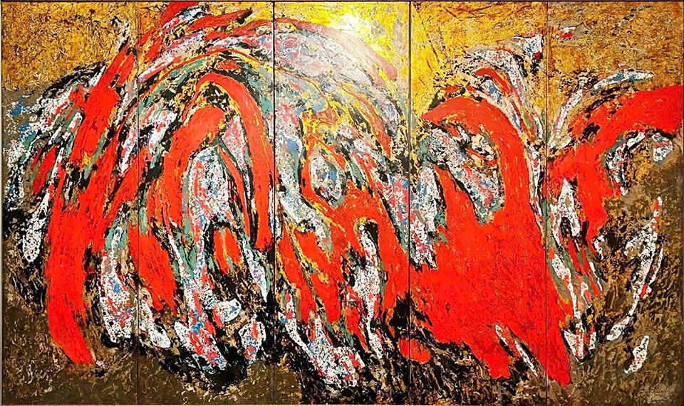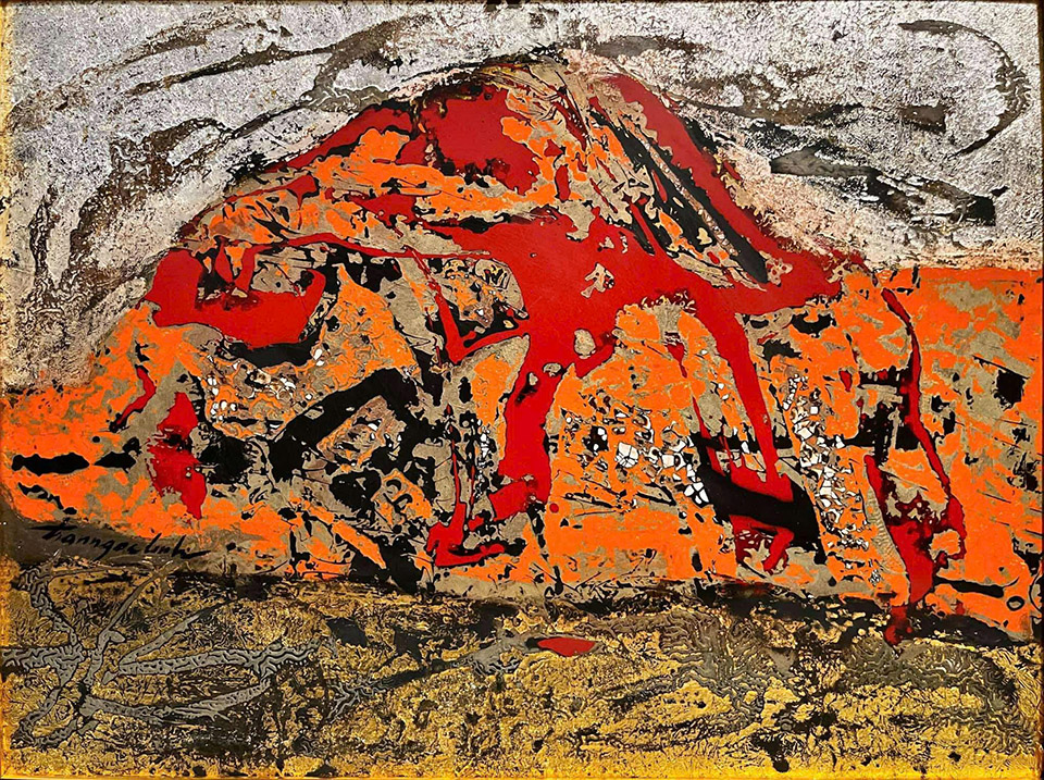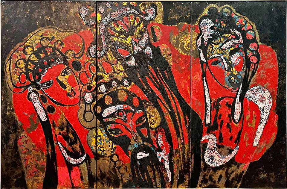 Ba sắc độ chủ đạo – đỏ, vàng, đen – vận hành như ba trục cảm xúc. Đỏ mang hơi ấm ký ức, vàng ngân như nhịp thở của niềm tin, đen là nơi trú của những im lặng. Những đường mài thấu lớp tạo hiệu ứng địa tầng – dấu vết thời gian hiếm gặp khi sơn mài bước vào trừu tượng hiện đại. Bề mặt ở đây không chỉ “đẹp” ở thị giác, mà còn gợi ra cảm giác về những lớp đời sống nằm sâu, đang được chậm rãi mở ra.