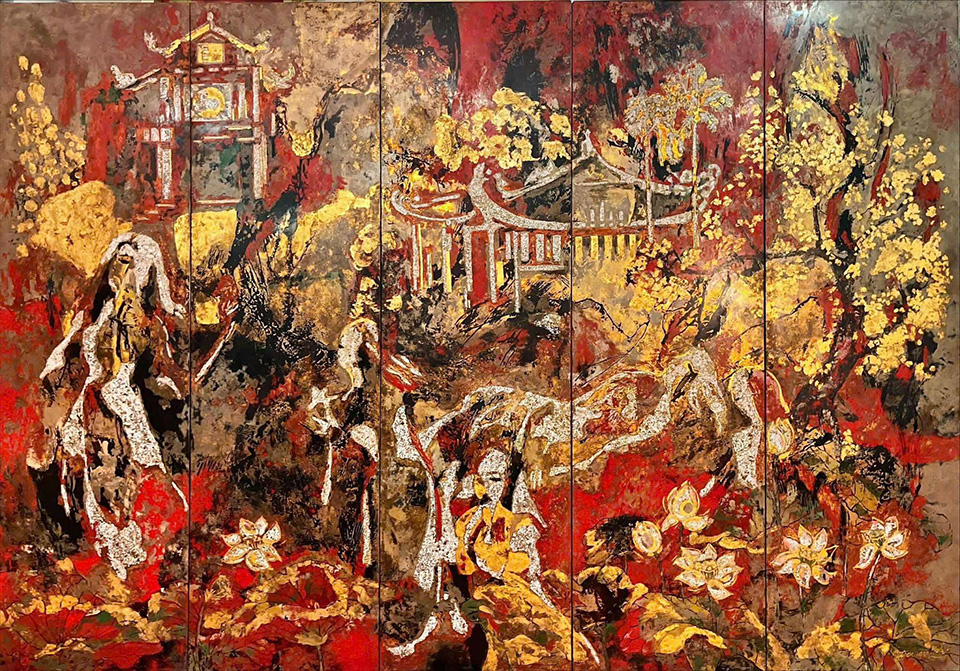 Triển lãm Âm sắc vàng son khai mạc ngày 22.11.2025 tại Bảo tàng Mỹ thuật TP.HCM, giới thiệu gần 70 tác phẩm thực hiện trong giai đoạn 2020 – 2025 – một khối lượng lao động lớn đối với sơn mài. Mỗi tác phẩm là một tầng thời gian, là chuỗi vòng lặp của kiên nhẫn và tình yêu nghề. Và ngay trong những ngày mở cửa đầu tiên, triển lãm đã đón một tín hiệu đẹp: sáu tác phẩm hữu duyên được các nhà sưu tập chọn mua, như một sự đồng cảm thầm lặng nhưng rõ ràng dành cho hành trình bền bỉ của nghệ sĩ.